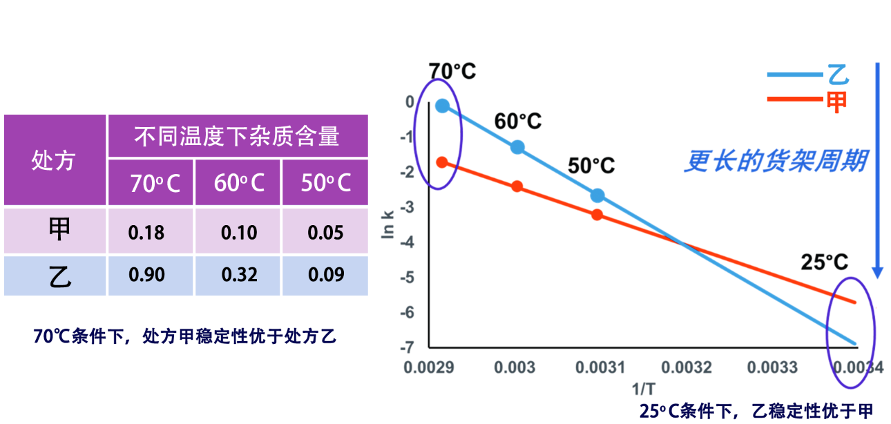 1.1类新药分子,欲开发首次人体实验制剂,经过初步实验,锁定了两种概念制剂,但是在不同温度条件下的加速稳定性结果相互矛盾,实验人员无法判定制剂稳定性的优劣。ASAP实验与ASAP模型显示经过这两种制剂对湿度变化的敏感程度(B值)均较低,但对温度变化的敏感程度(Ea)有着巨大的差异。处方乙的活化能更高,因此在高温条件下显示出更快的降解,但随着温度的下降,其降解速率也下降的更快,因此在长期稳定性条件下,化学稳定性反而更好。