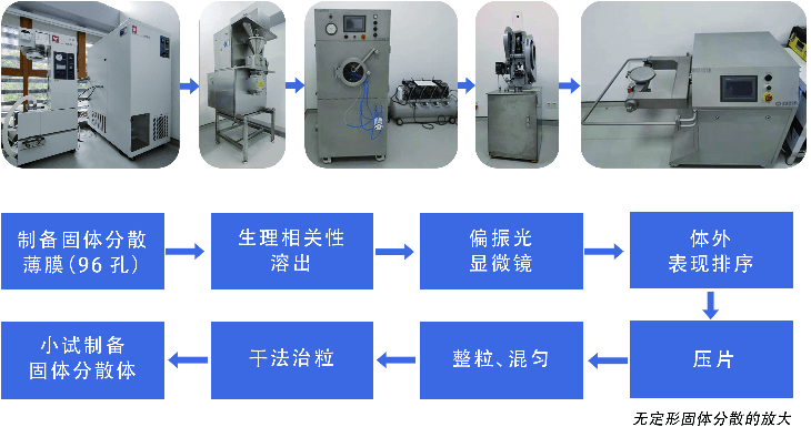 在筛选到候选的无定形固体分散处方后,可以通过有机溶剂喷雾干燥、热熔挤出的方式将无定形固体分散放大到g~kg级别.