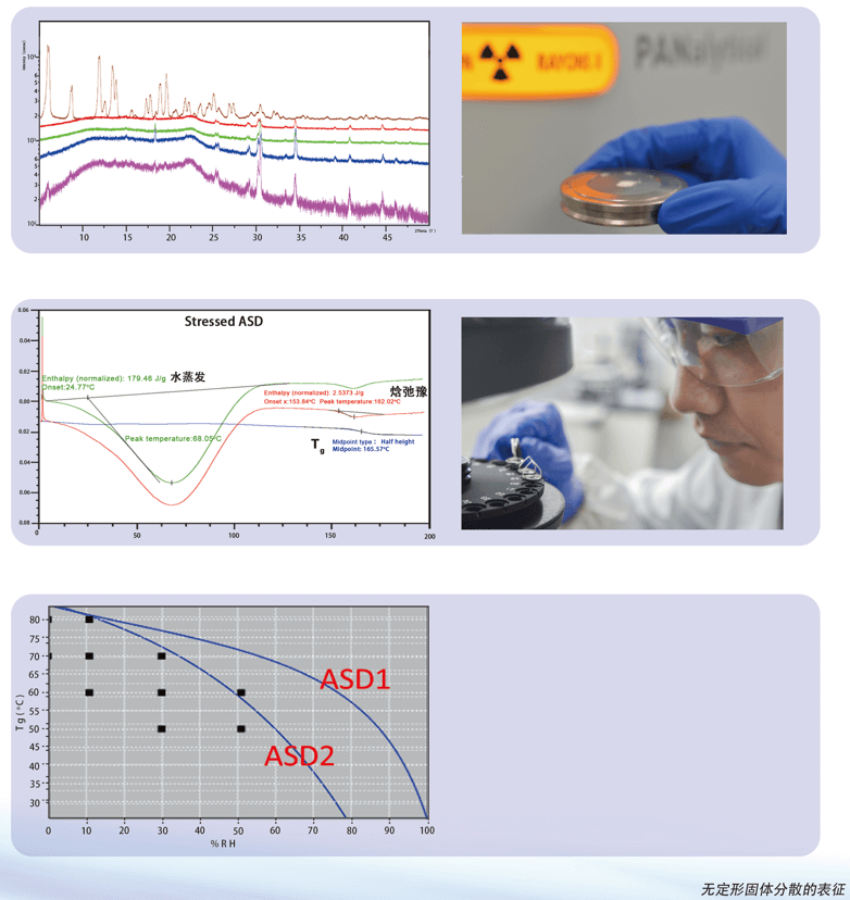 在放大后可以针对无定形固体分散体进行更加深入的表征和研究:X-射线粉末衍射(XRPD),mDSC(调制DSC)方式测试Tg(玻璃态转化温度)以及焓弛豫(β-relaxation,无定形材料重排后导致的焓变);材料的动态水吸附特性(不同相对湿度下的引湿增重);由于引湿水塑化导致Tg的变化等(图)。