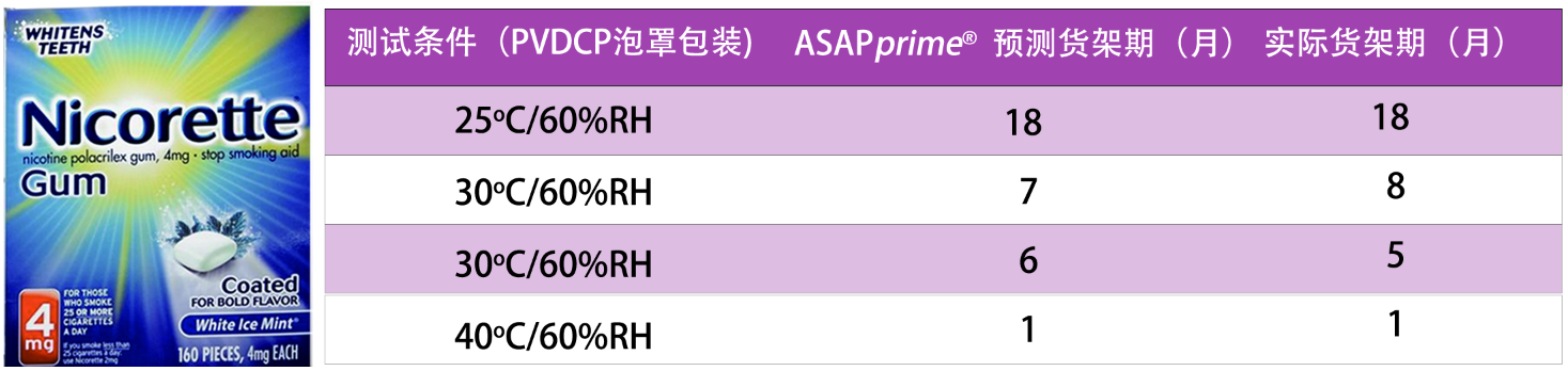 尼古丁戒烟糖在缓解戒烟过程中的焦虑情绪有着重要的应用,该产品采用PVDC泡罩包装。但是尼古丁在长期稳定性放置过程中会升华,并透过PVDC,从而导致含量下降。研发人员通过ASAP加速实验,快速预测长期稳定性,该预测结果与长期稳定性结果吻合的很好(GSK在2013年AAPS年会发表案例)。