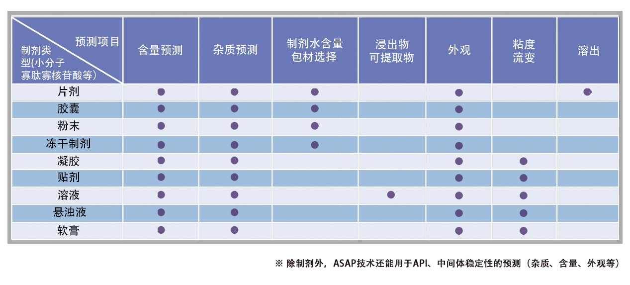 ASAP技术适用于多种不同种类的制剂,可以预测含量、杂质、颜色、溶出等核心药学参数的长期稳定性与制剂水活度、包装之间的量化关系,从而尽早识别并规避开发过程中可能遇到的稳定性相关风险