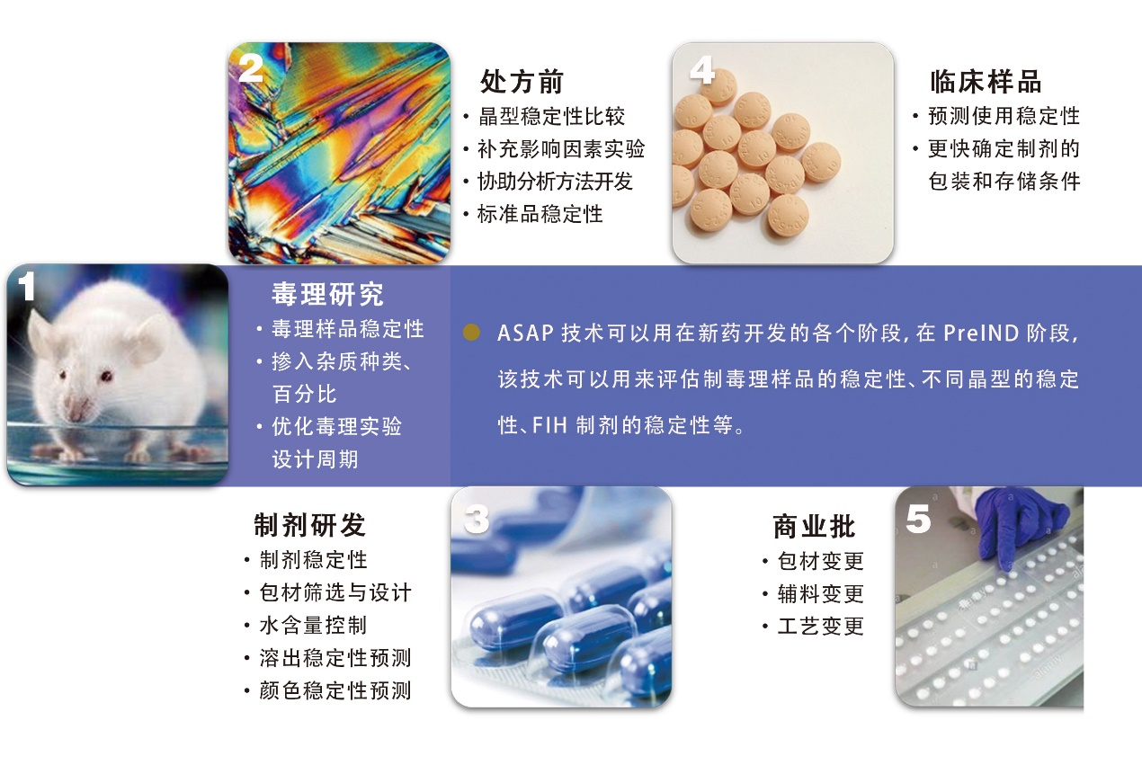ASAP技术可以用在新药开发的各个阶段,在PreIND阶段,该技术可以用来评估制毒理样品的稳定性、不同晶型的稳定性、FIH制剂的稳定性等