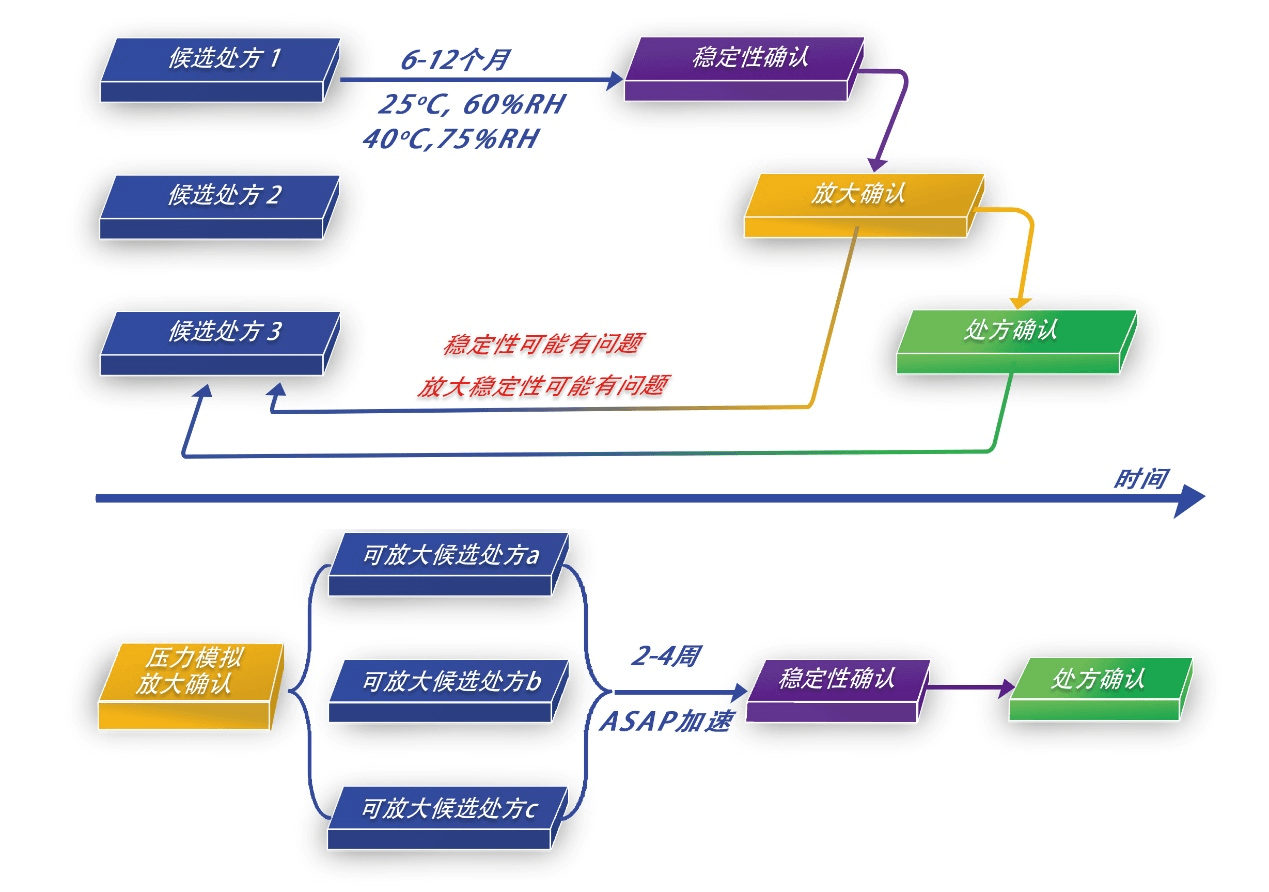 制剂快速开发:制剂的长期稳定性、生产可行性是在产品开发过程中的两个主要风险。传统的制剂开发,往往只有1种制剂处方在研,在产品稳定性预定问题的情况下,整个项目需要重新开发制剂,重新评估产品的稳定性,制剂迭代的时间成本在1年以上。对于低剂量的制剂,海维采用3个以上生产放大验证过的制剂处方,平行使用ASAP技术直接评估产品的长期稳定性,从而直接消除生产可行性与长期稳定性方面的风险